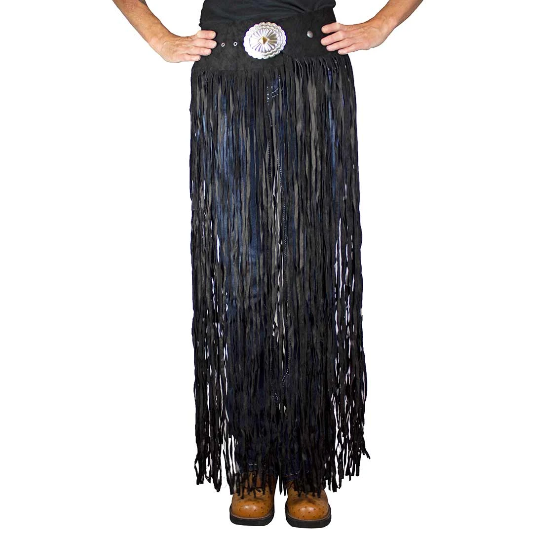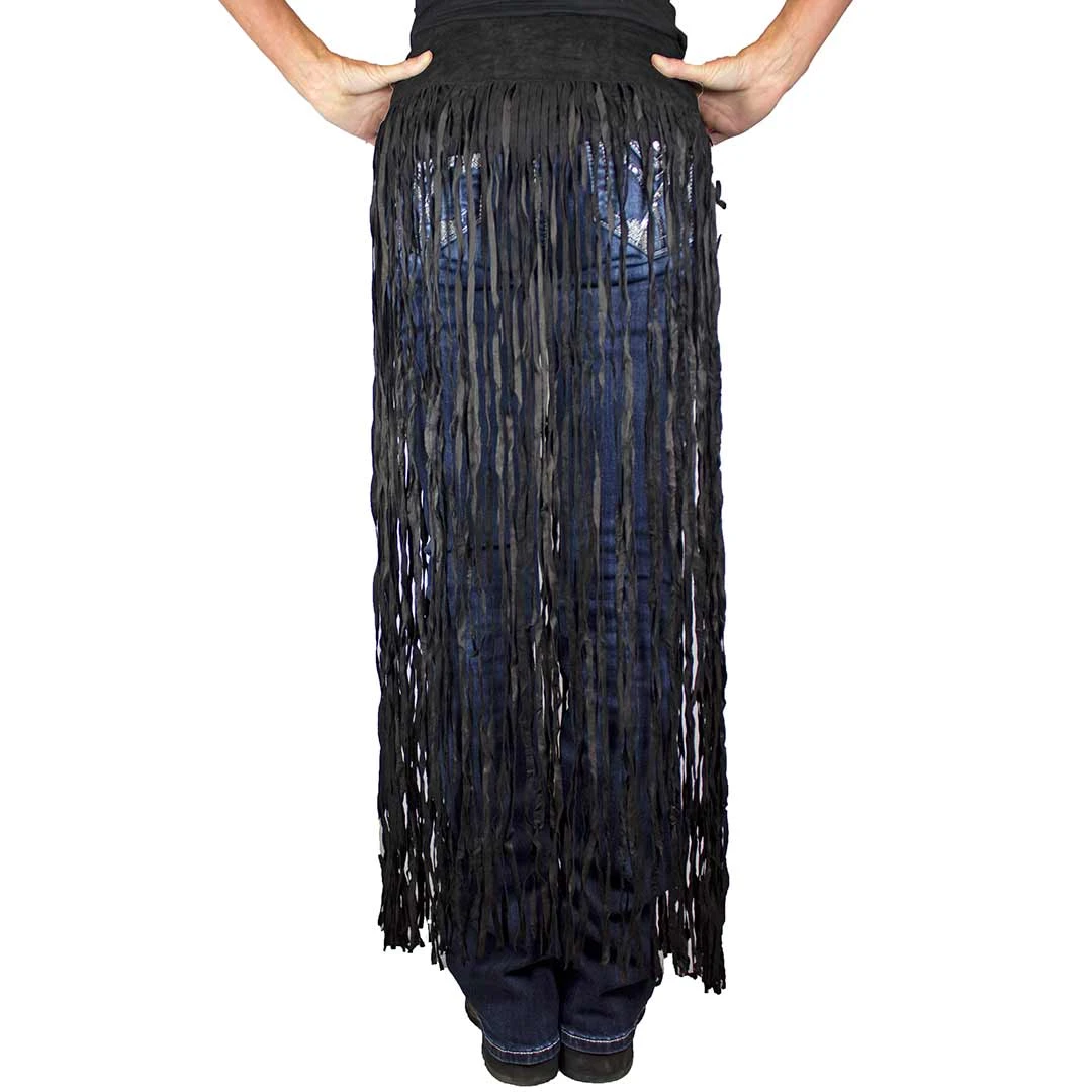 A long fringed belt with an oval concho buckle from Pat Dahnke. The concho buckle makes a great focal on the long fringed curly black suede belt. A simple hook and rivet closure makes this a winner over pants, jeans, a dress, or shorts. It’s a very clean look.