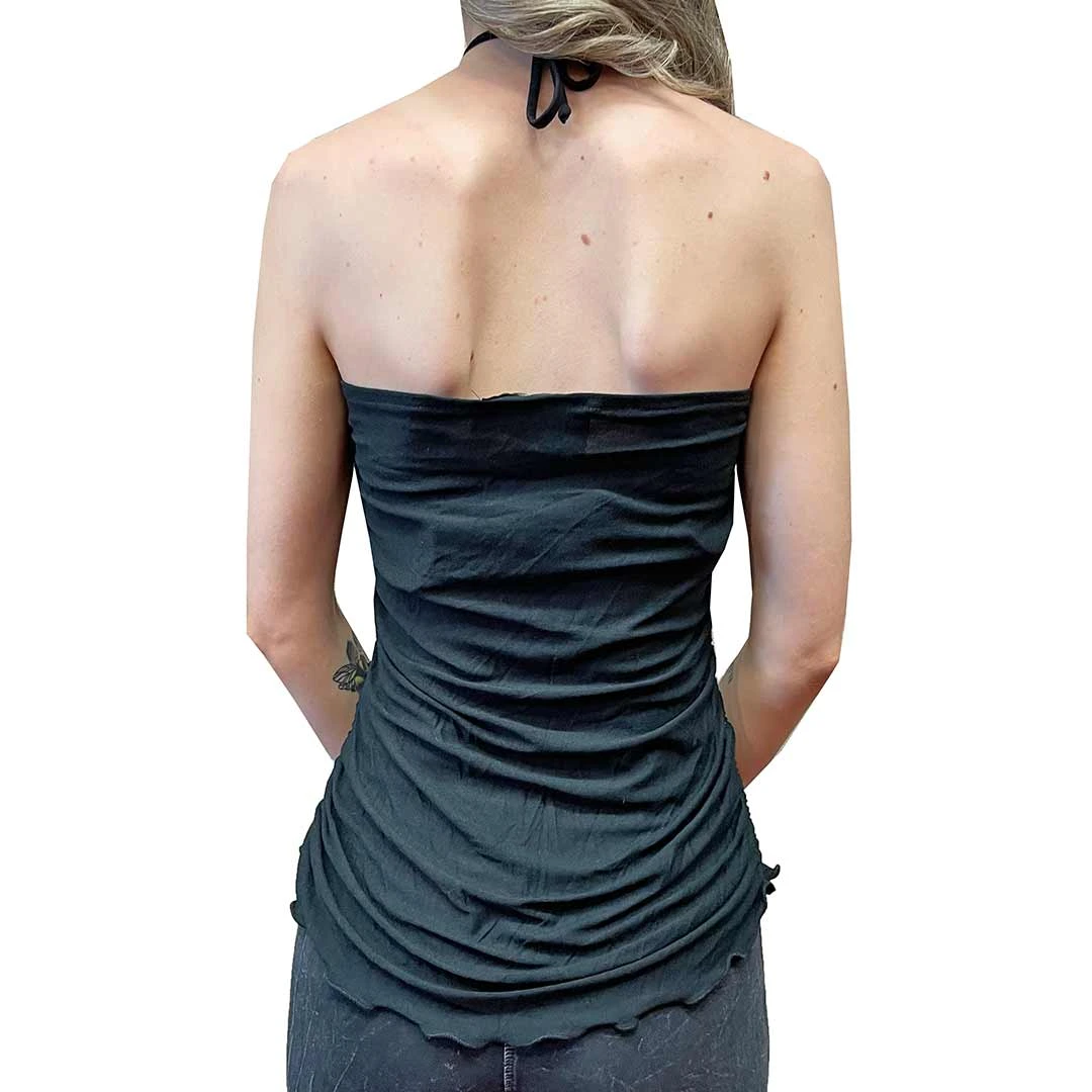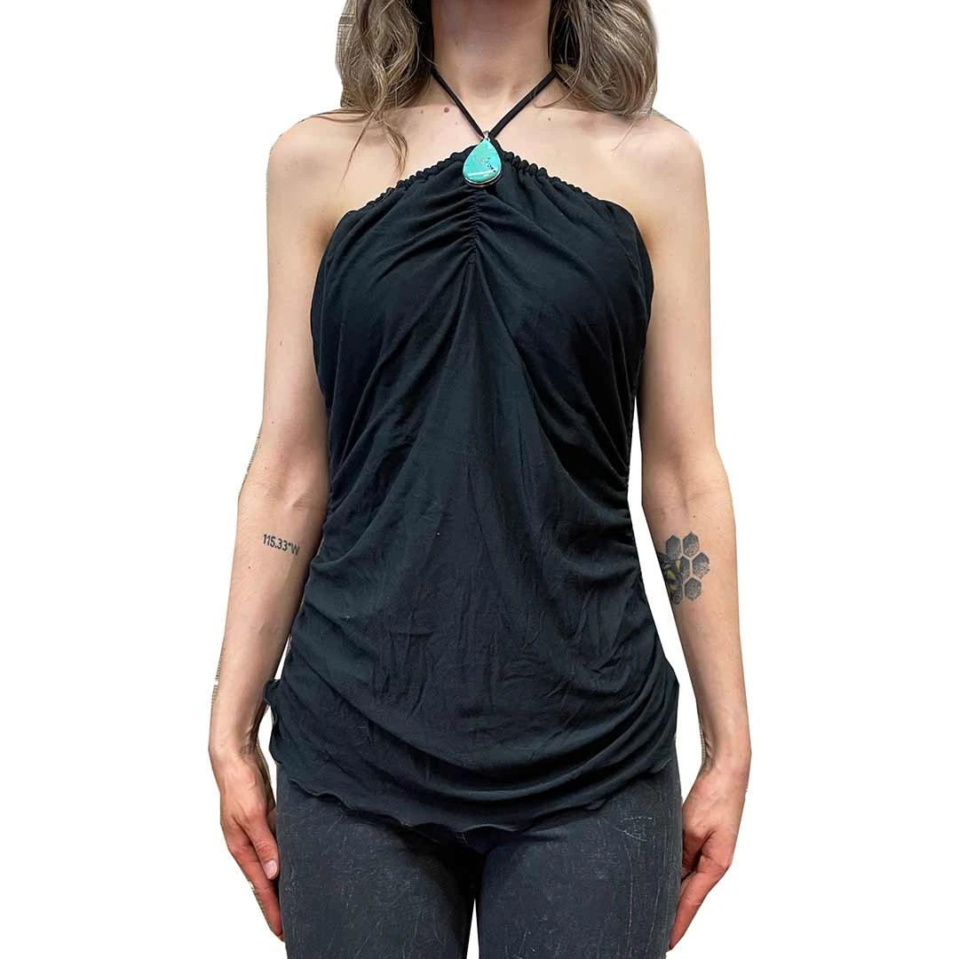 This cabochon top is gathered on the sides for a flattering fit. The cabochon is removable for cleaning. It boasts a sizable genuine turquoise stone set in sterling silver, which can also be used as a pendant on a necklace.