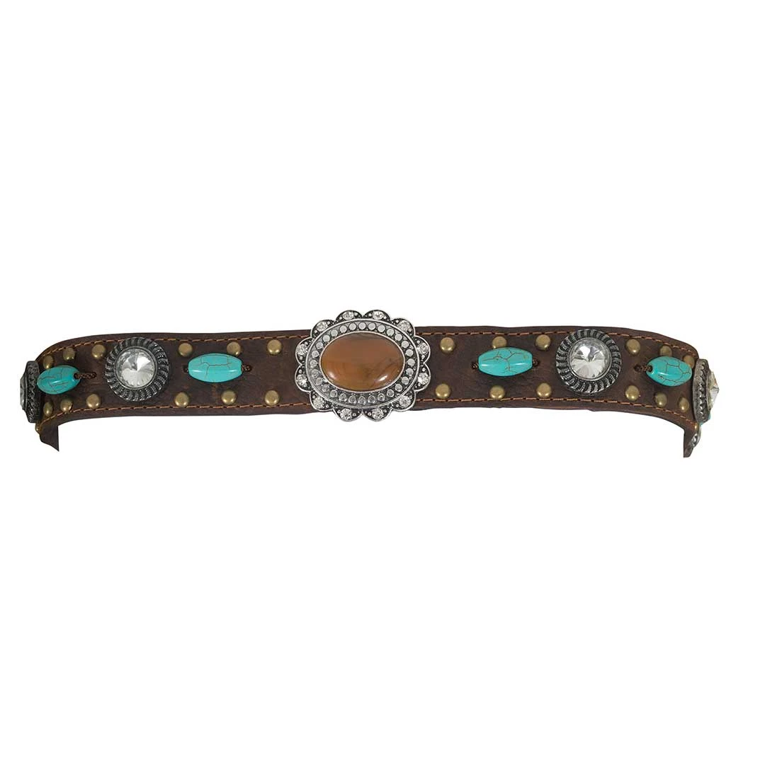 Dress up your favorite cowboy hat with this hand crafted wide tooled leather hat band featuring large turquoise concho on the front, small stone and stud conchos around the sides and matching studs.