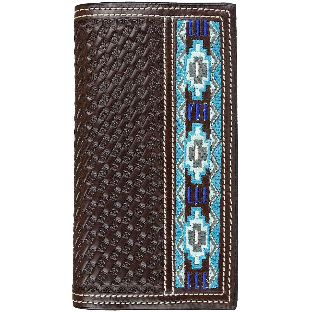 Keep your cards safe and handy with this stylish rodeo wallet from Ranger Belt Co. The wallet features blue and turquoise Aztec embroidery with basket weave tooling, 13 card slots, ID window and four cash slots.