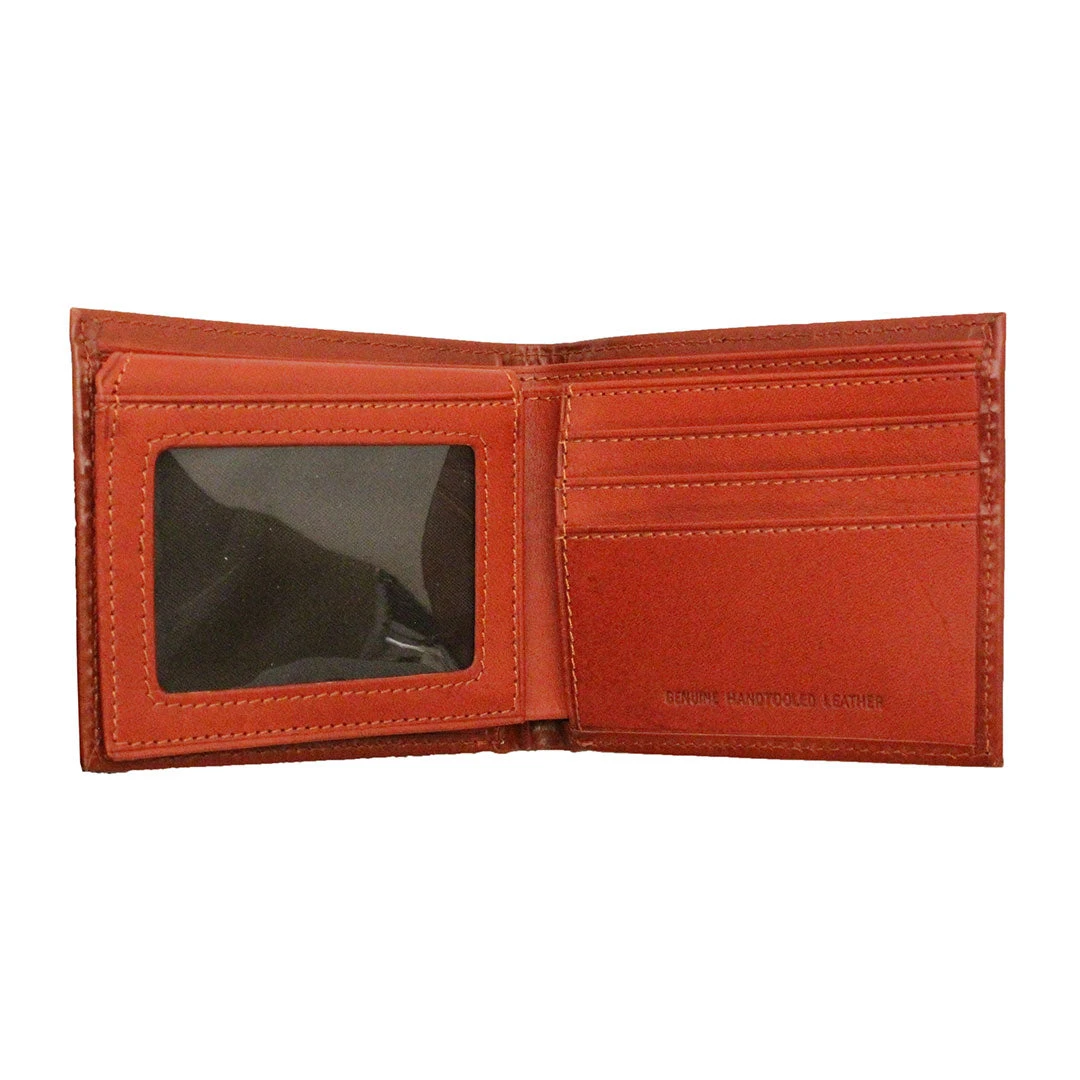 From Ranger Belt Co. this bi-fold wallet features floral tooled design on the front and basketweave design, separate ID window, money slot and credit card holders.