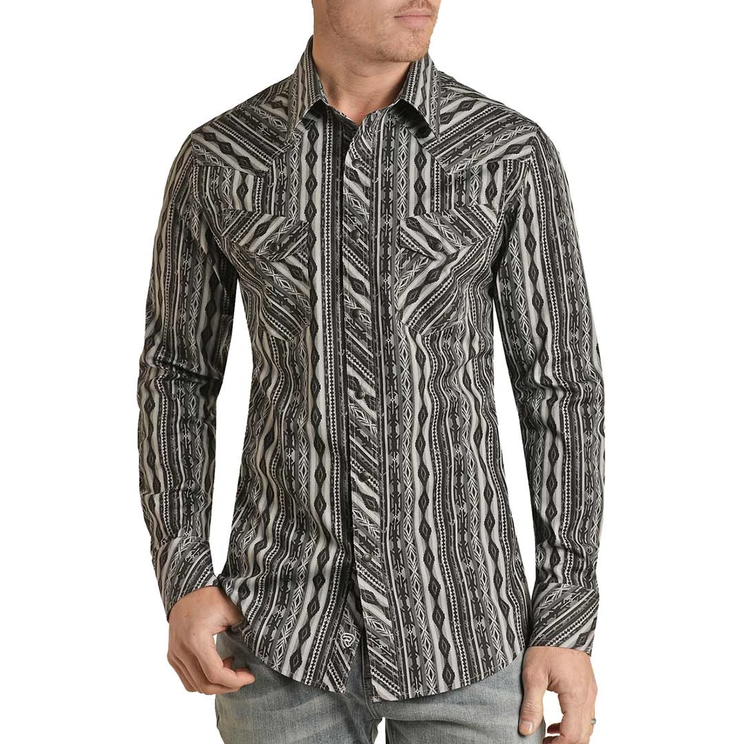 From Rock & Roll Cowboy, this men’s snap shirt features a black and grey Aztec stripe print. Out with the old and in with the bold! This retro print is a must have this season.