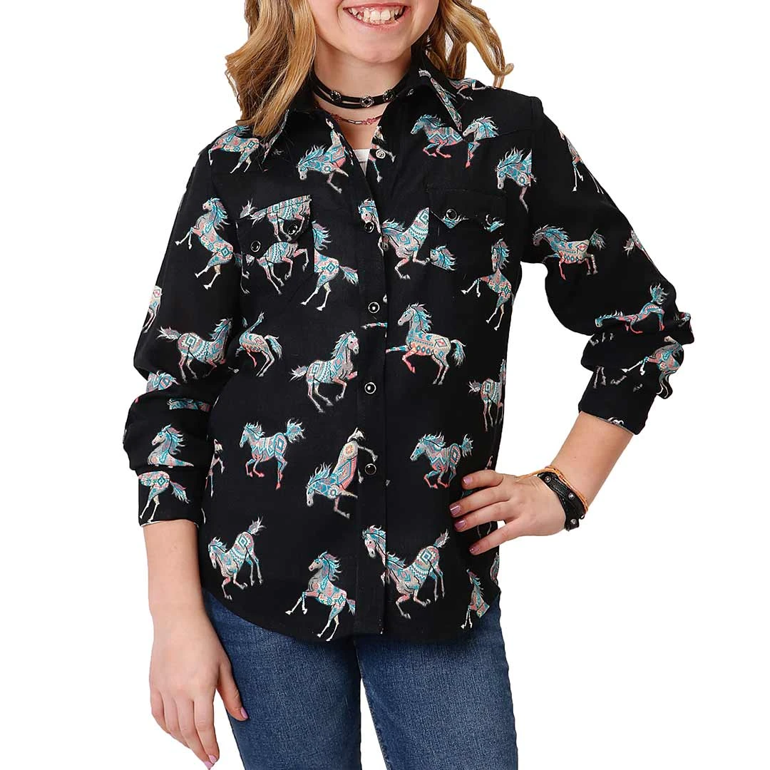 We never shy away from a bold print and neither should your little girl! This girl’s rayon snap blouse from Roper features a horse print and two sawtooth pockets.