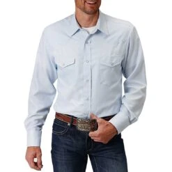 From Roper, this is a men’s long sleeve poly cotton shirt. It features two flap snap pockets and a spread collar. There are pointed back and front yokes and classic western styling.