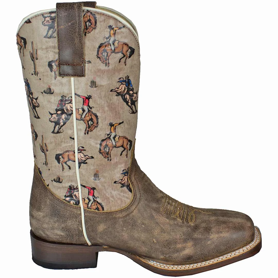 This authentic youth Roper cowboy boot features a buckin bronc print shaft, brown vamp and ivory piping accents.