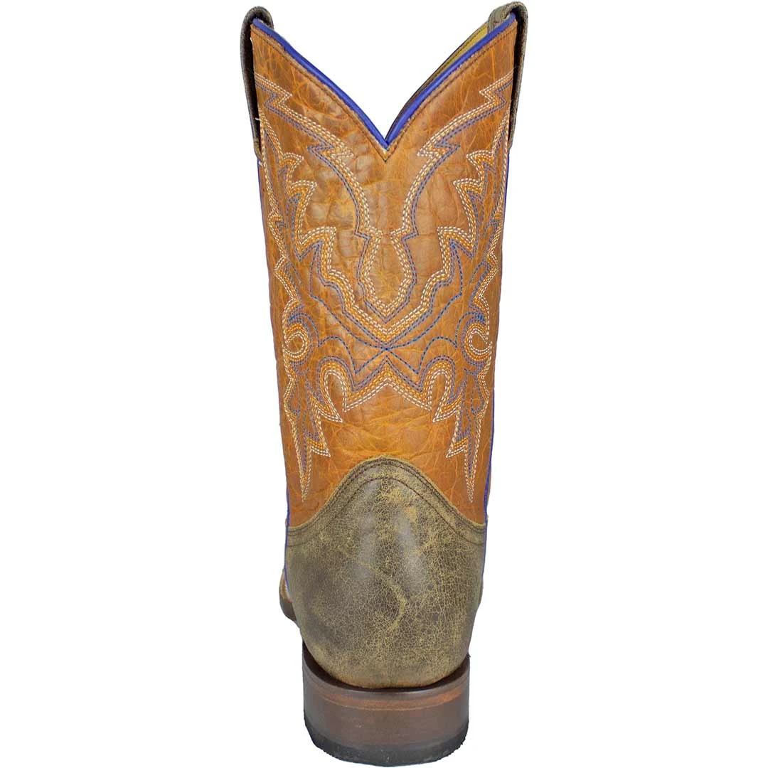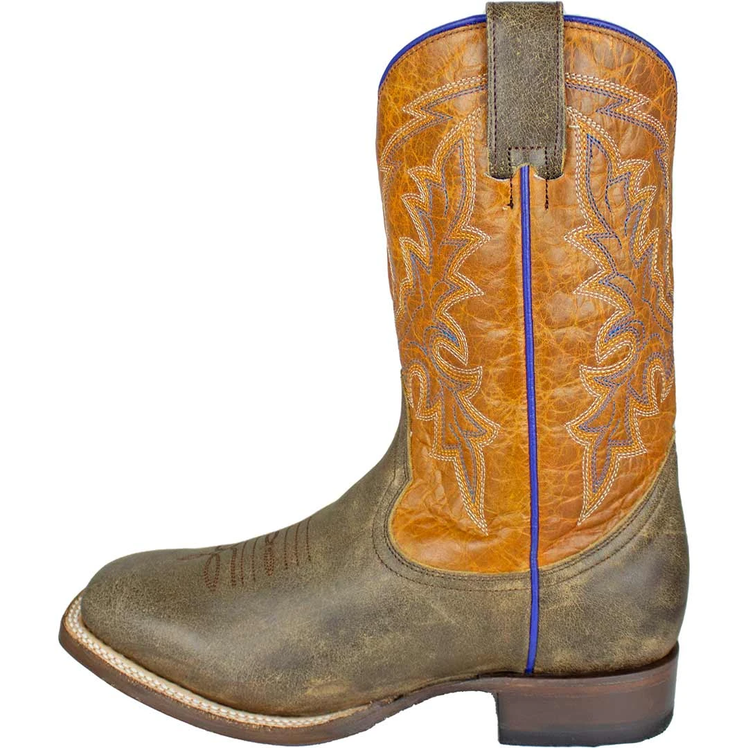 This authentic kids’ Roper cowboy boot features a rust shaft and brown vamp, with 7 row classic stitching and blue piping accents.