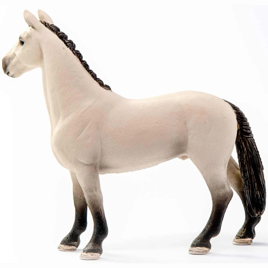 The Hanoverian Gelding, Red Dun from Schleich Horse Club has a splendidly shiny dun coat, dark legs and a dark snout. He is ready for the next competition with his carefully braided mane and tail. Dressage or show jumping? Hanoverians are exceptionally talented horses in both disciplines. They are competitive, learn quickly, have an even temperament and move both gracefully and powerfully. Fun Fact: The breeding history of Hanoverians goes back to the 16th century.