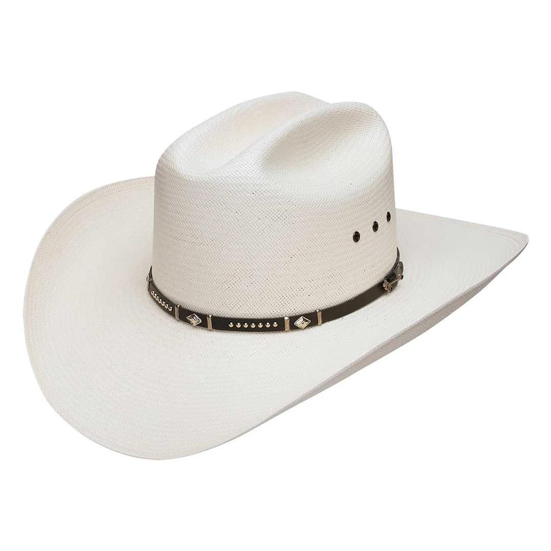 From Stetson, the Lucky 7 10X straw cowboy hat features a low cattleman crown with a black Concho stud leather hat band. You can never go wrong with the quality of Stetson.