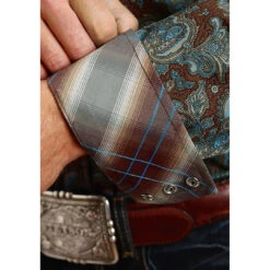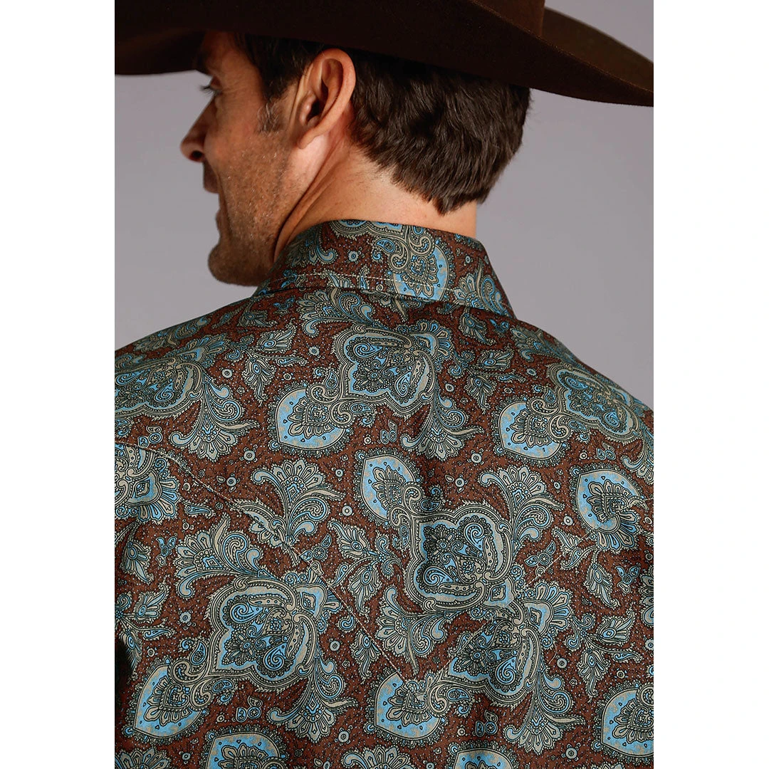 From Stetson, this long sleeve brown and teal paisley print shirt features western style yokes, contrast fabric on under cuffs and collar, single point pocket flaps and opaque logo snaps.