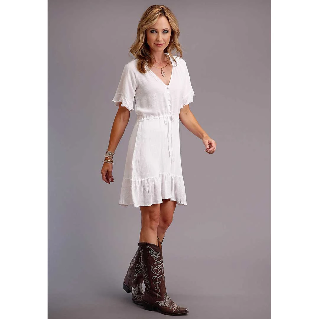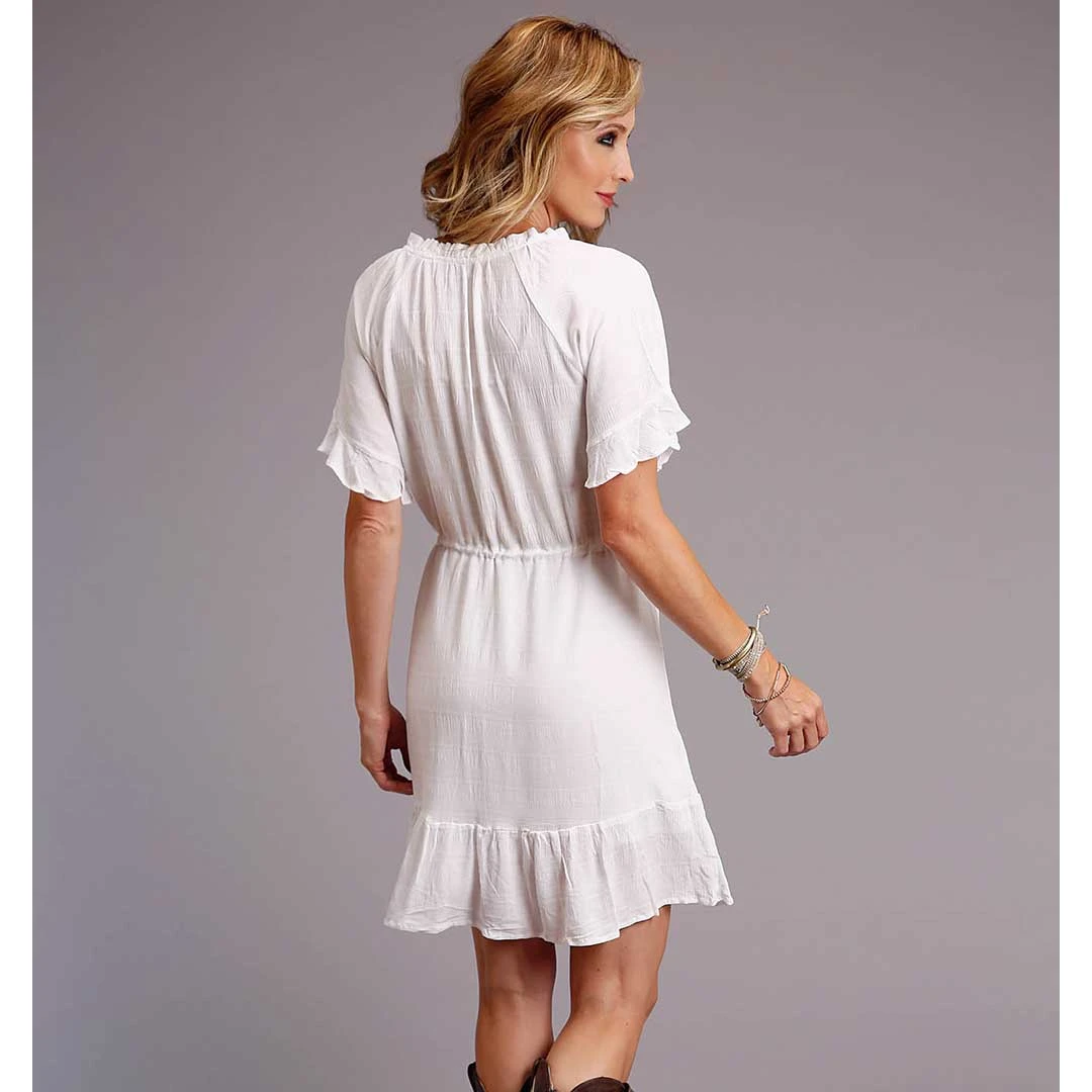 We love this textured rayon dress from Stetson! With all its subtle feminine features like a V-neck with self covered buttons, oversized short raglan sleeves and a deep ruffle hem, you’ll love it too!