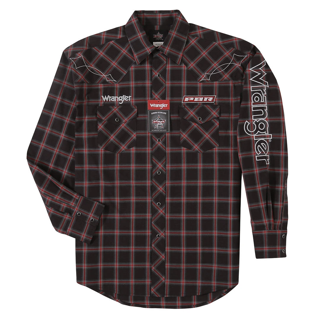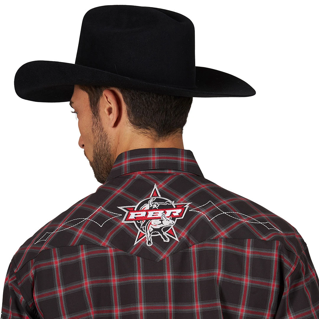 Super comfortable with a bold black and red plaid, it’s a shirt that’s packed with extras. Wrangler and PBR logo embroidery mix with authentic Western details including front and back yokes, snap flap pockets and snap cuffs for a winning look. Made for those who live the honor tradition and everything truly wrapped up in the word ‘cowboy’.