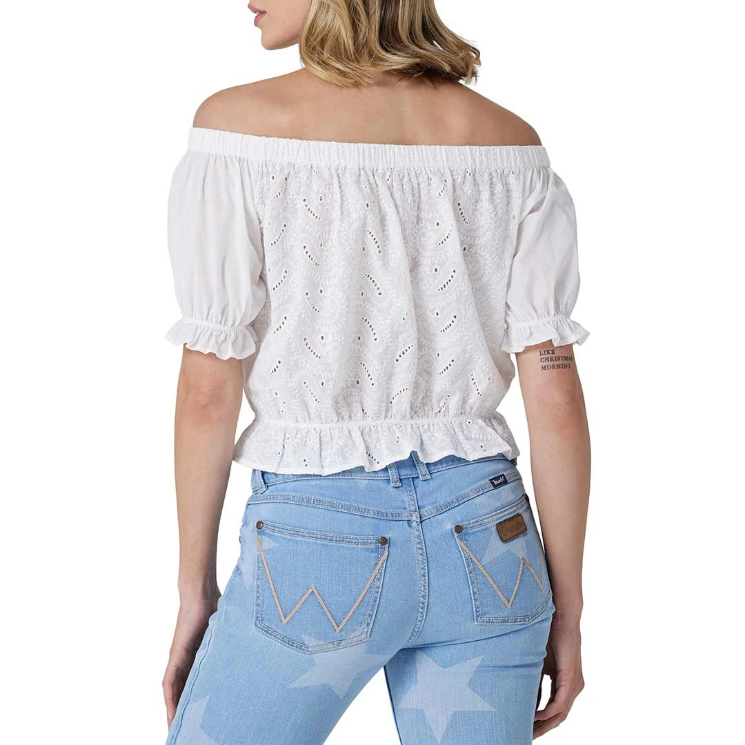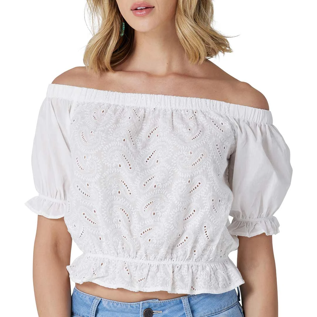 Giving the cold shoulder has never looked so good as it does in the Wrangler Retro off-the-shoulder blouse. It’s made from 100% cotton, with a paisley pattern and small eyelets delicately embroidered into the fabric. The off-the-shoulder look stays in place with ruching around the shoulders, hem, and sleeves that take traditional stitching up a notch. Plus, the light fluttering around the hemline adds a feminine flair to any outfit. Pair it with some flare jeans for a ‘70s-inspired look that is simply groovy.