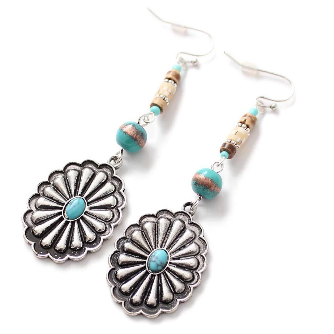 Bold yet delicate, these classic and fun earrings feature a large Concho with a turquoise stone in the center and beads of multiple mediums leading up to French hooks.