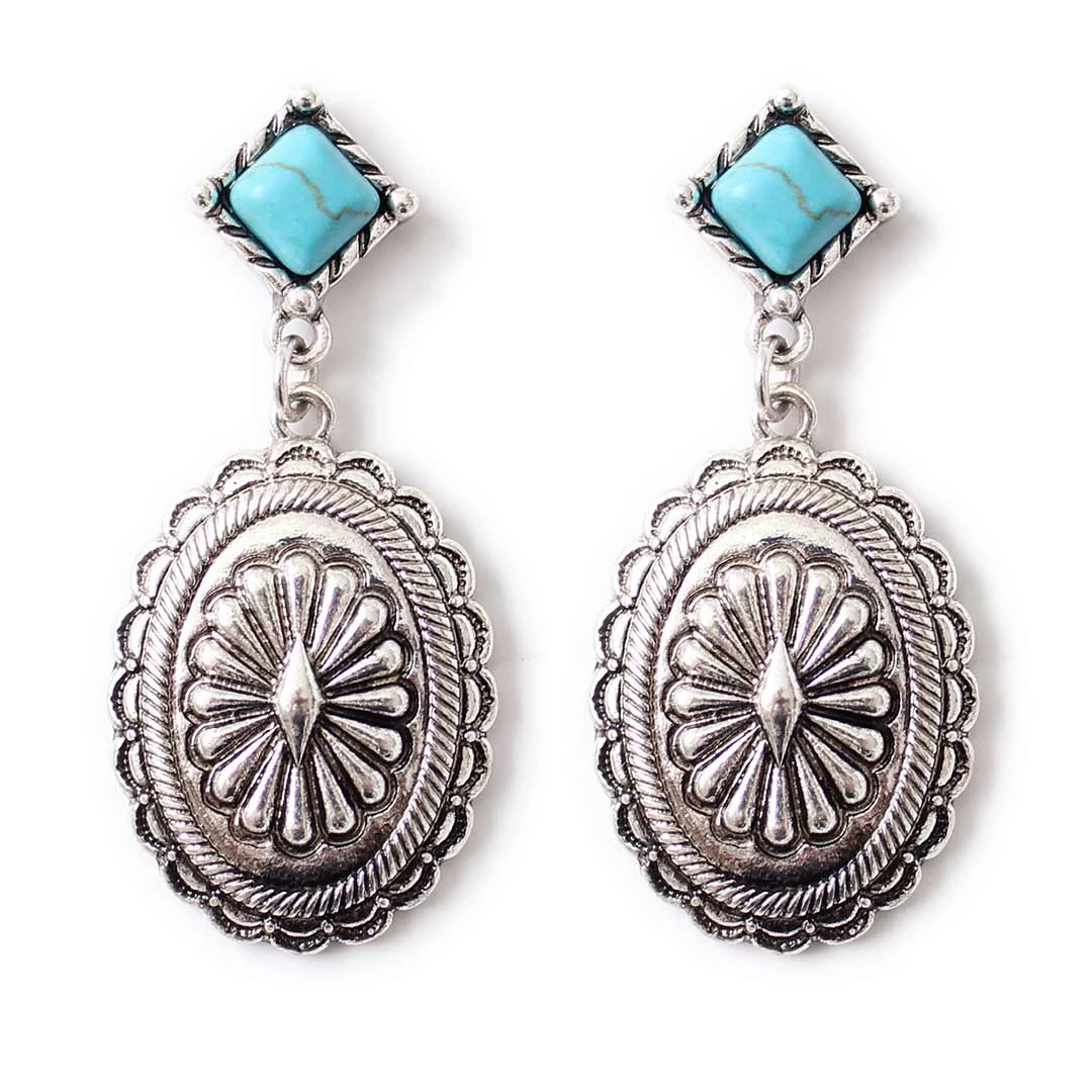 As cute as a button! Wyo-Horse traditional Concho earrings feature a traditional diamond turquoise stud with a large antique silver Concho that dangles below.